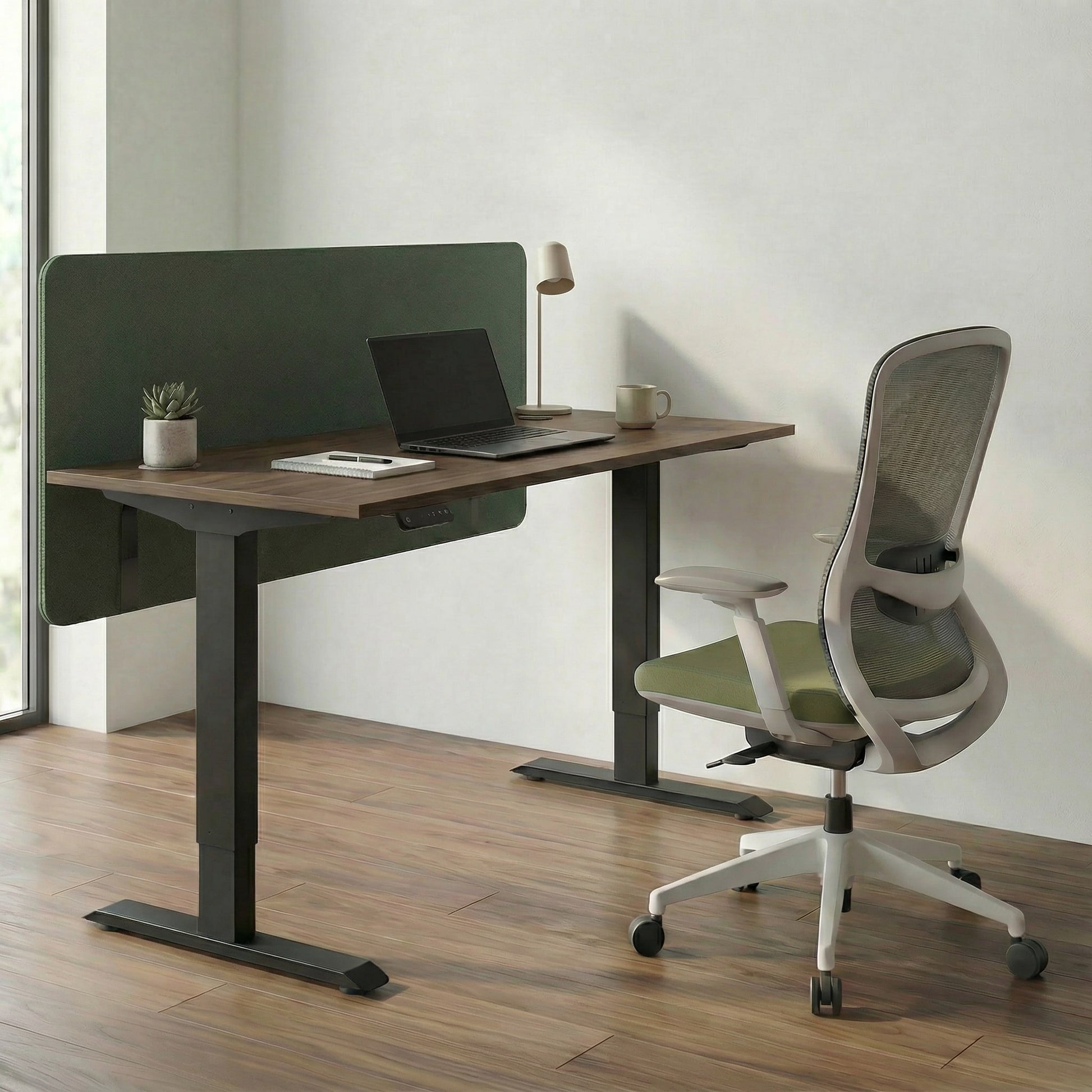 Modern home office with a height adjustable desk with a green privacy panel on the front, laptop on a stand, and elephant artwork on the wall.