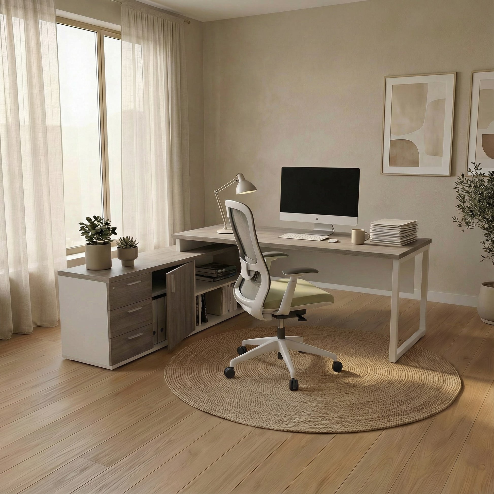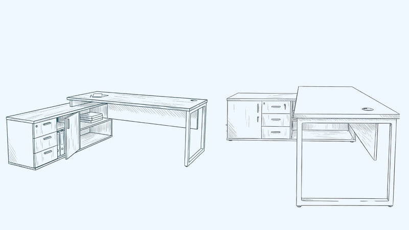 A refined L-shaped desk that combines generous workspace and integrated storage for focused, professional work.